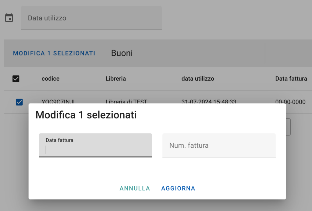 La libreria potrà selezionare 1 o più ticket formativi ed aggiungere la data e il numero di fatturazione