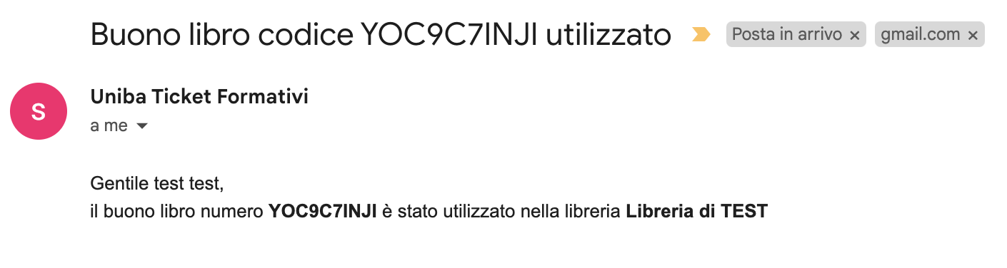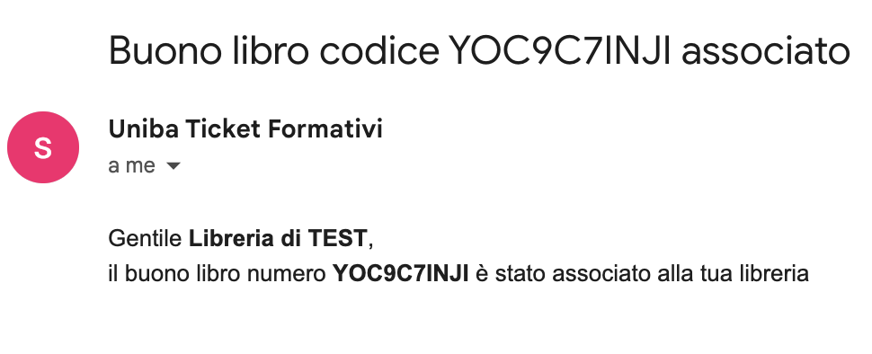 Di seguito l’email che viene inviata in automatico alla libreria che ha associato il Ticket formativo